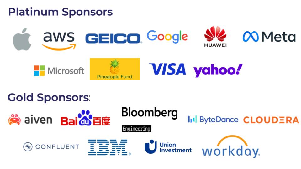 - Gold Sponsors: Amazon Web Services, AxonOps, Bloomberg, Gradle, KSolves, Red Hat and Snowflake