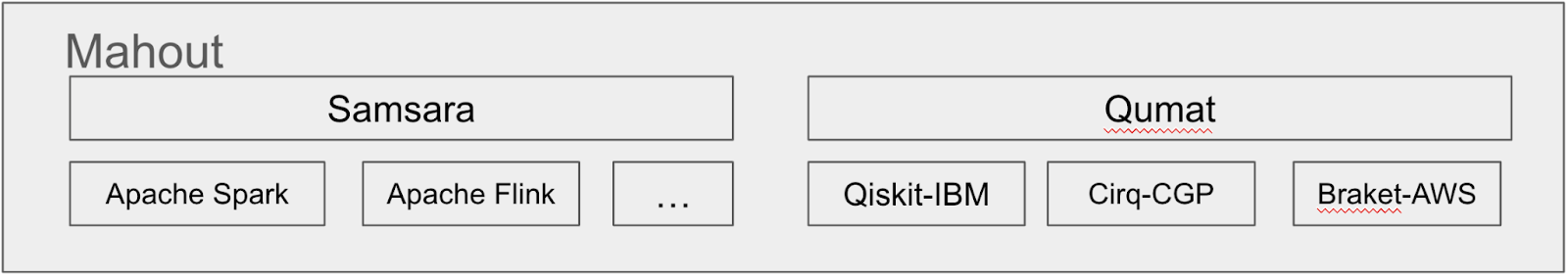 Following Apache Mahout’s core values of interoperability and providing tools for matrix arithmetic at scale, we have added a new layer (qumat) alongside our existing distributed matrix math framework (Samsara), that allows quantum researchers and developers to write code once and run it on any back-end available.